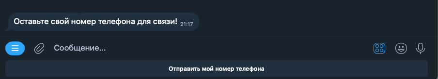 Сообщение, запрашивающее номер телефона пользователя. Telegram предлагает поделиться номером одной кнопкой.