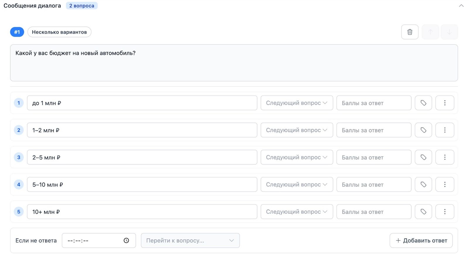 При создании диалога добавляем сообщения через кнопку Добавить вопрос.