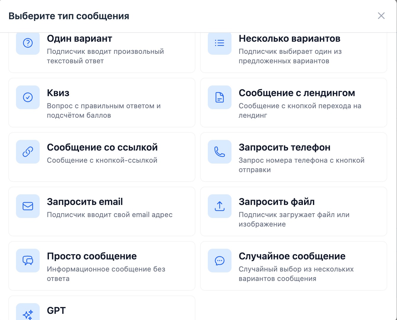 Диалоги позволяют создавать интерактивные сценарии взаимодействия с подписчиками. Используйте разные типы вопросов и ветвление для персонализации пути каждого пользователя.