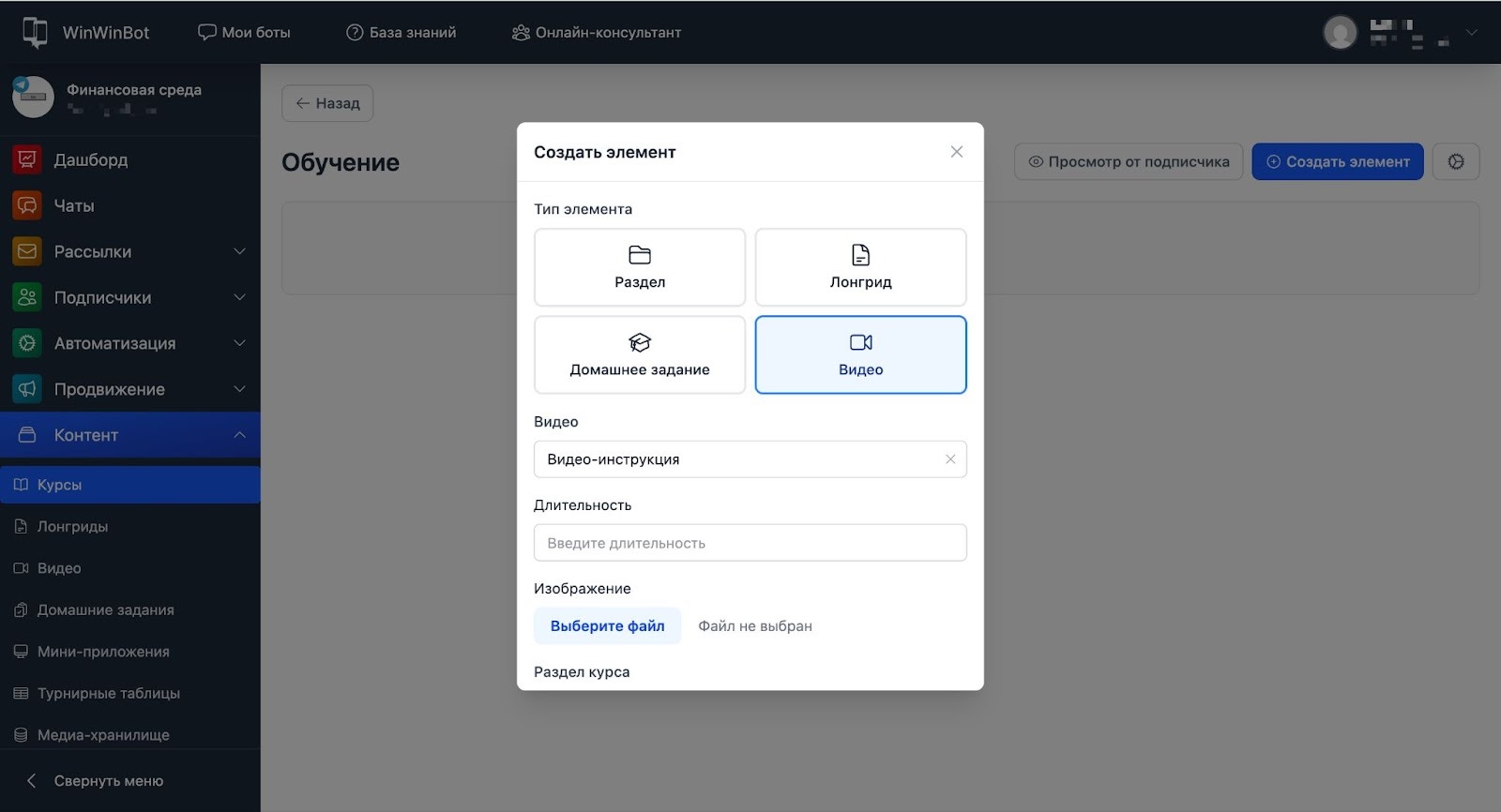 Видео добавляется в структуру курса как элемент урока. Подписчики проходят курс последовательно, просматривают видео и получают автоматические уведомления о прогрессе.
