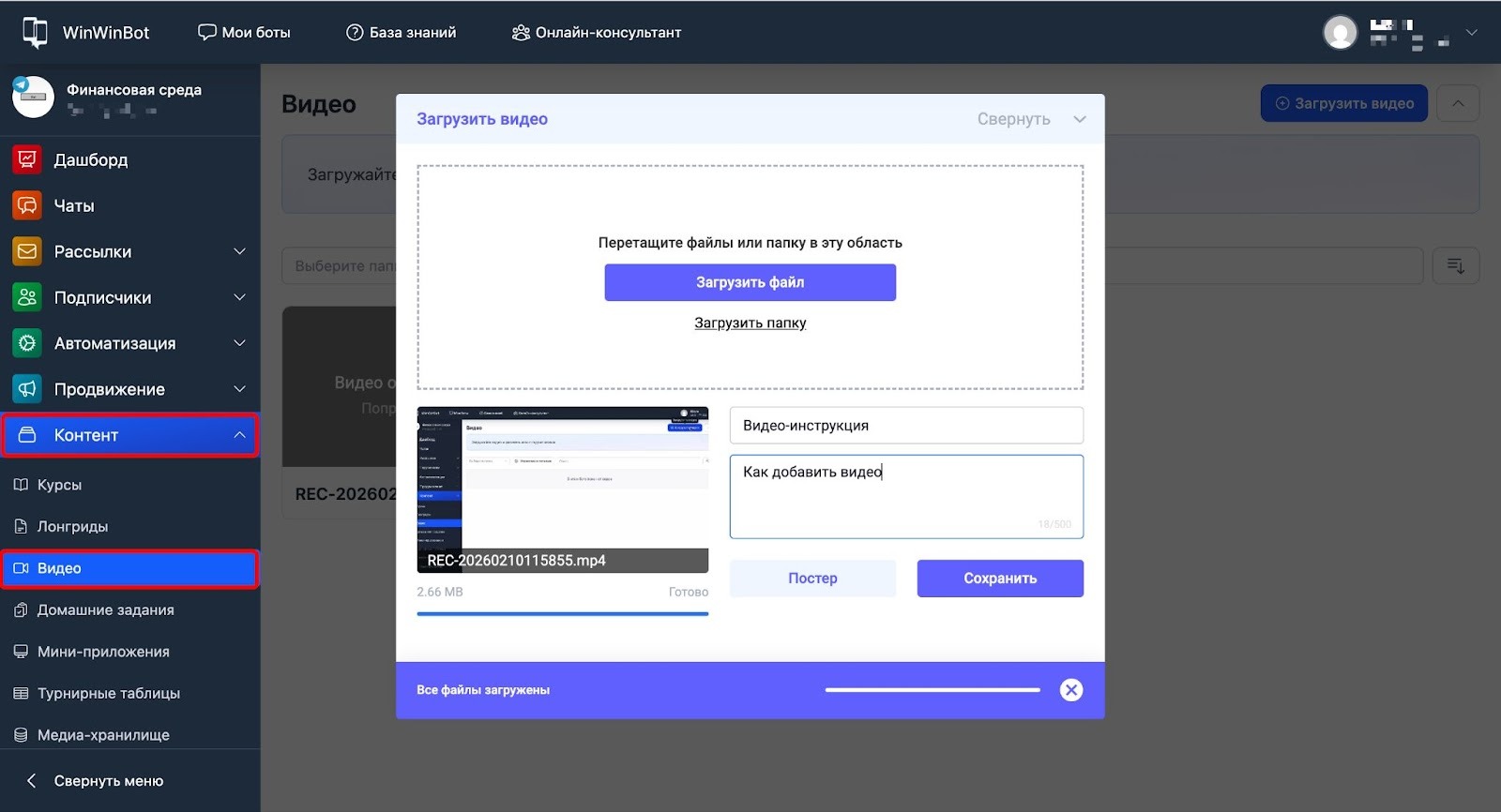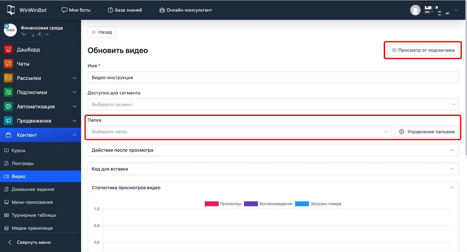 Видео из раздела Контент → Видео отличается от видеофайлов в Медиа-хранилище возможностью отслеживания статистики. Если нужно просто отправить видео в сообщении без аналитики, используем Медиа-хранилище. Если важно отслеживать просмотры, длительность и вовлечённость подписчиков — загружаем видео через раздел Видео.