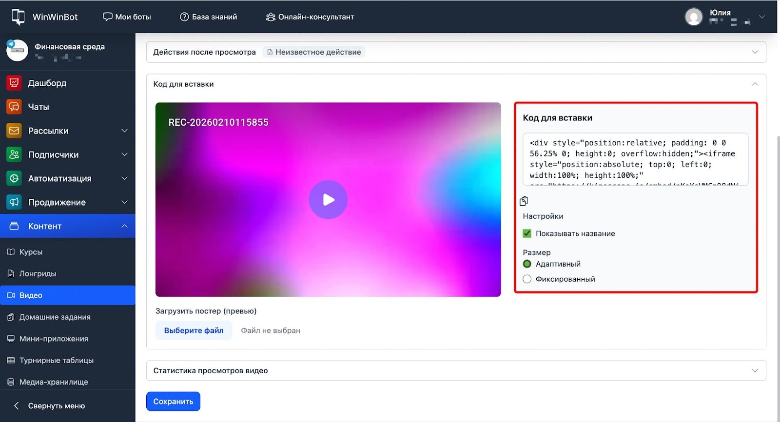 - Адаптивный — видео подстраивается под ширину экрана (рекомендуется для мобильных устройств);