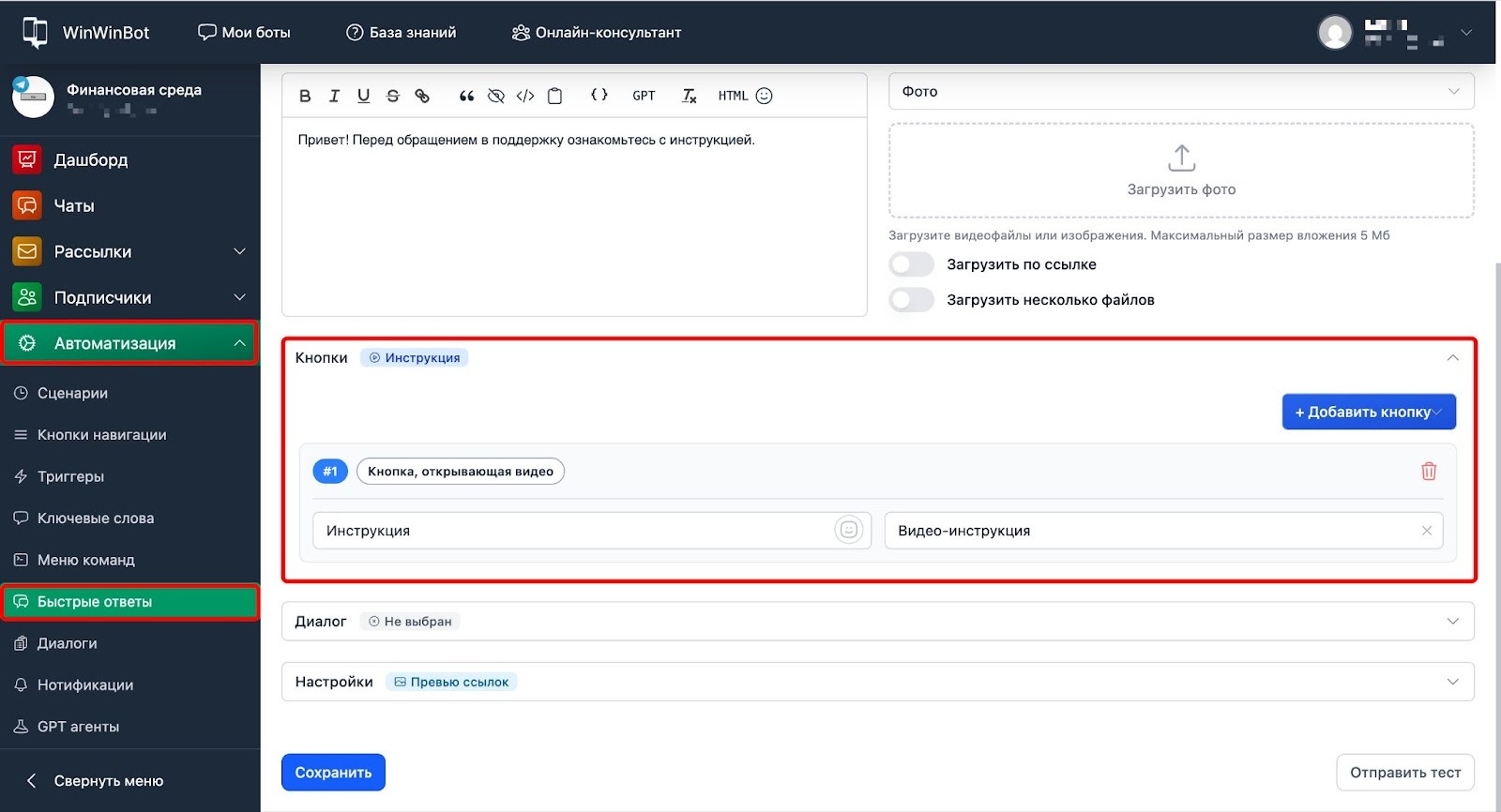- Создаём или редактируем сообщение в разделе Автоматизация → Сценарии, Рассылки или Быстрые ответы.