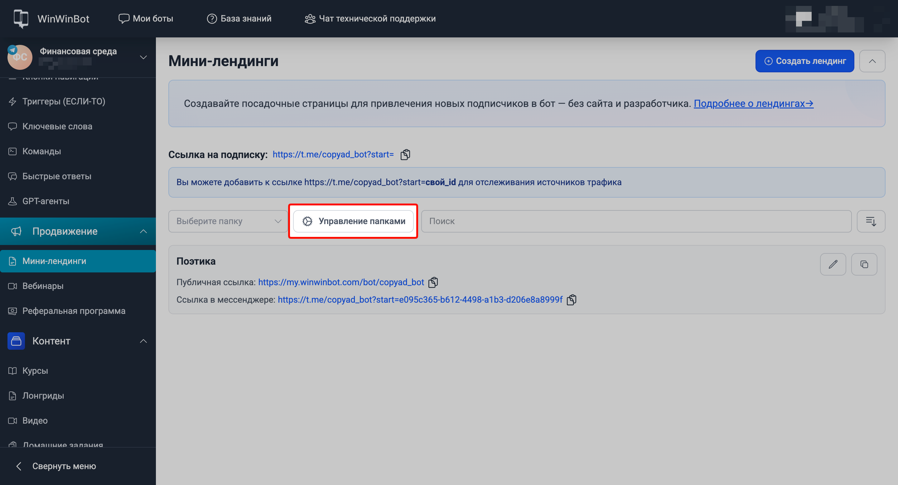 Для сортировки лендингов создаём папки через кнопку Управление папками.