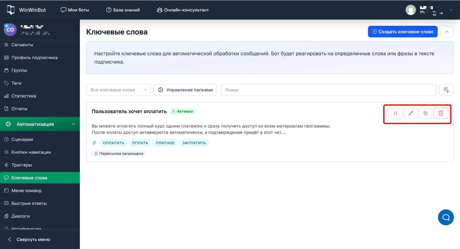 Ключевые слова — слова или фразы, на которые автоматически реагирует бот. Когда подписчик отправляет одно из заданных ключевых слов, система автоматически отправляет заготовленное сообщение.