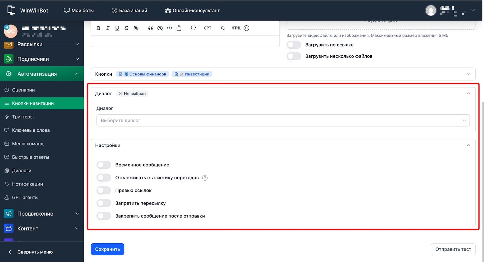 8. При необходимости добавляем кнопки в сообщение. Такие кнопки прикрепляются под сообщением, а не в нижней части интерфейса.