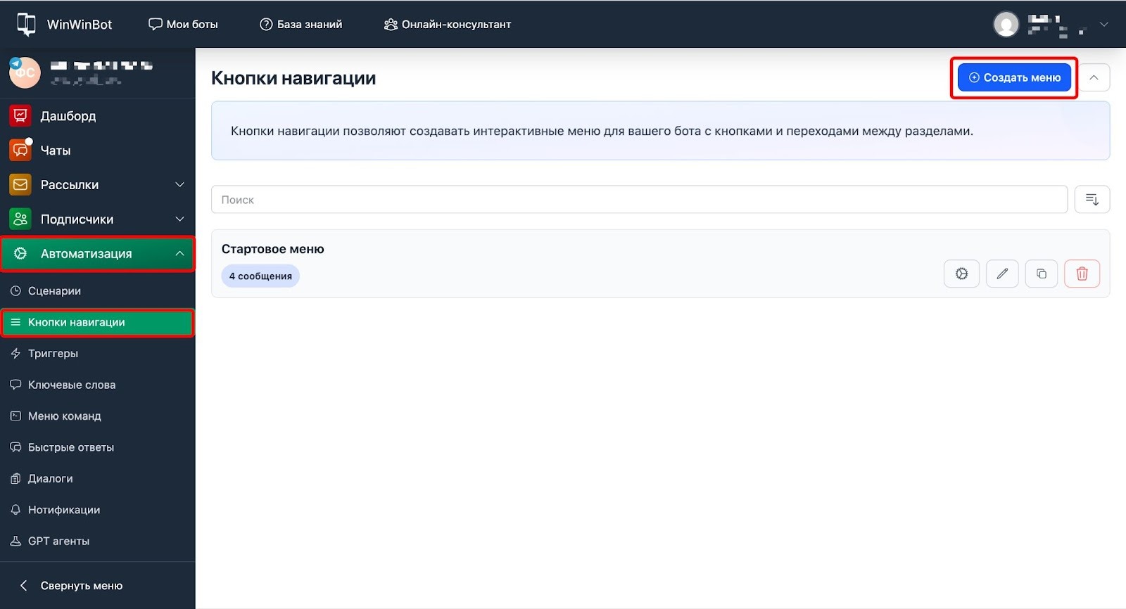 Меню отображается только после активации через точки запуска взаимодействия с ботом: сценарий, триггер, рассылку и команду.