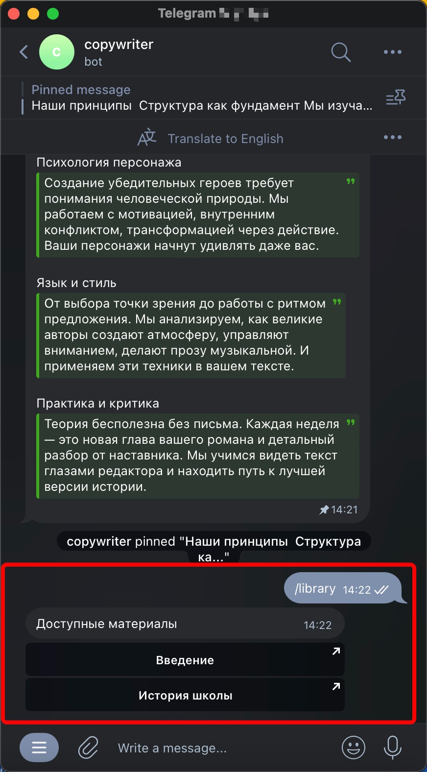 После ввода команды подписчиком бот отправляет заранее настроенное сообщение.