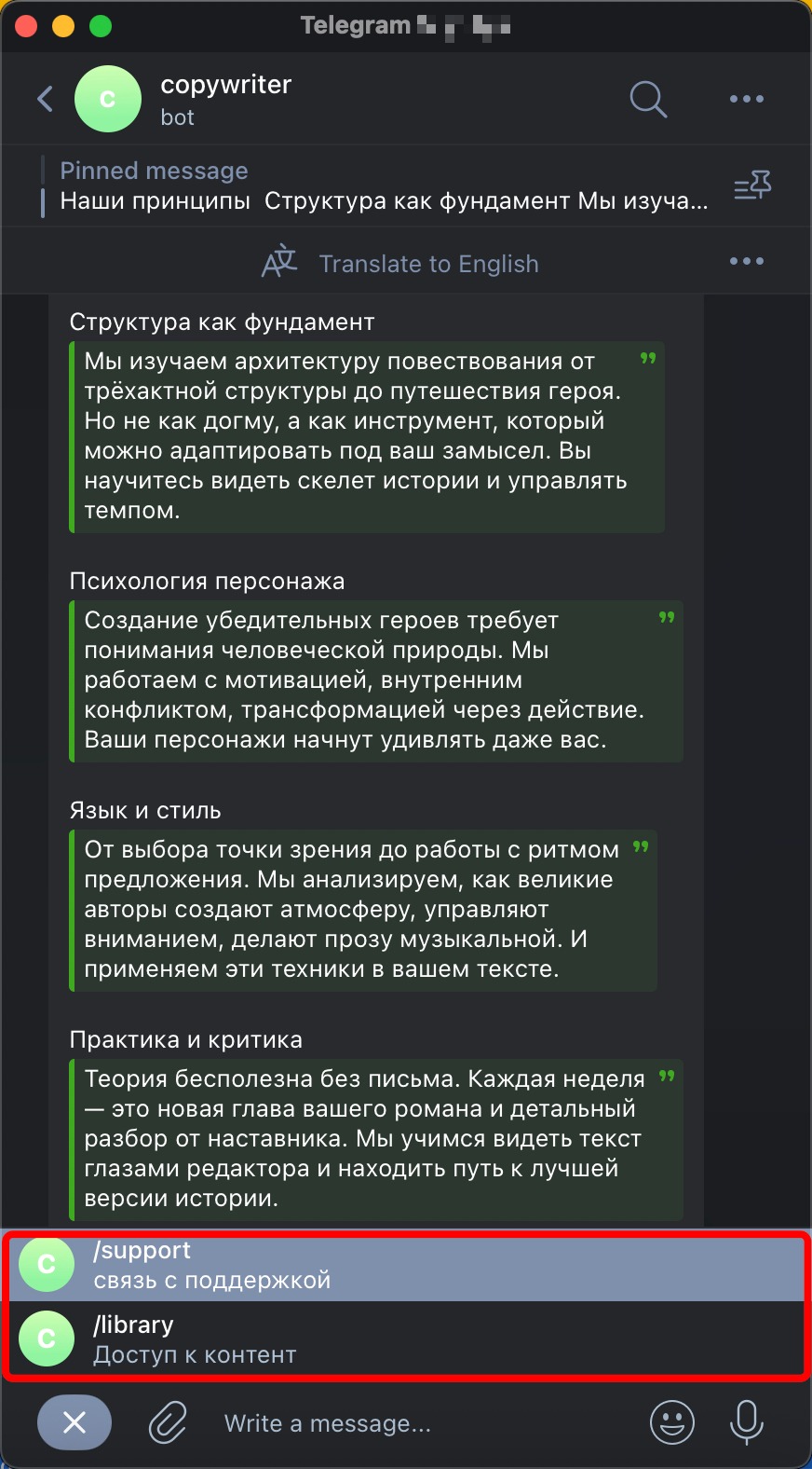 Команды всегда пишутся латиницей со слэшем в начале: /start, /help, /support.