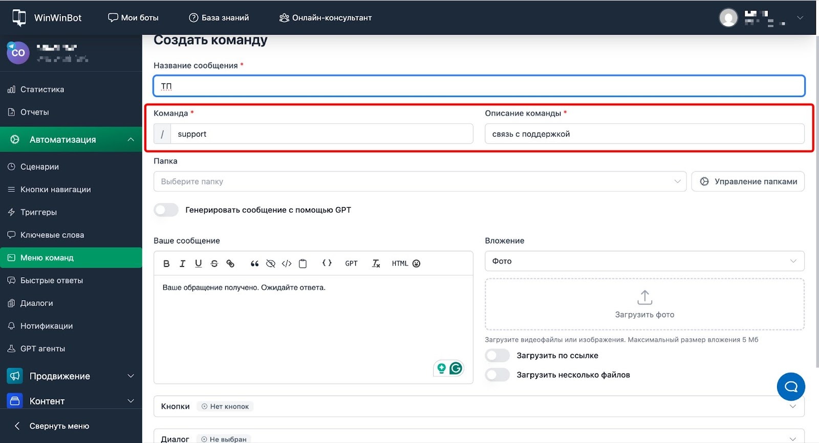 - Команда — команда латиницей без пробелов (например, start, help, buy);