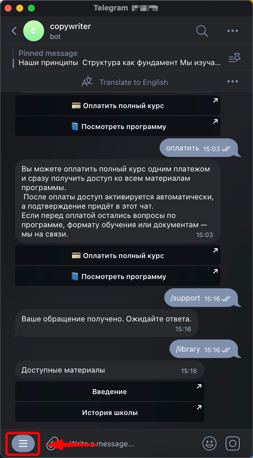 Меню команд — это постоянно доступный список действий для подписчиков, который отображается в боте слева от текстового поля ввода сообщения.
