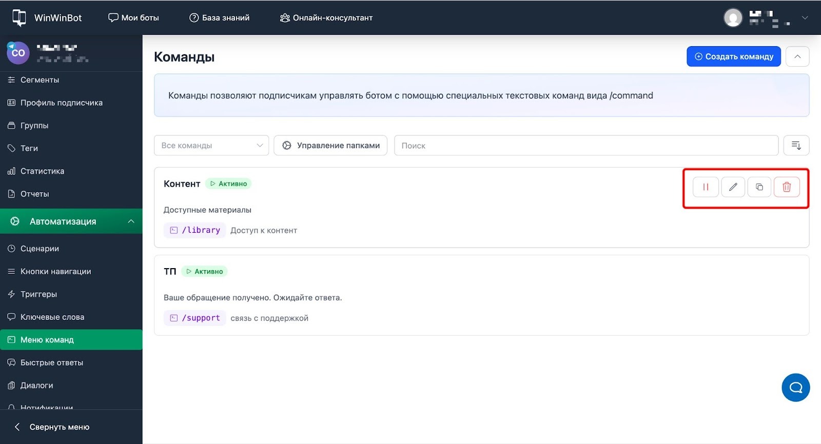- Открываем раздел Автоматизация → Меню команд.