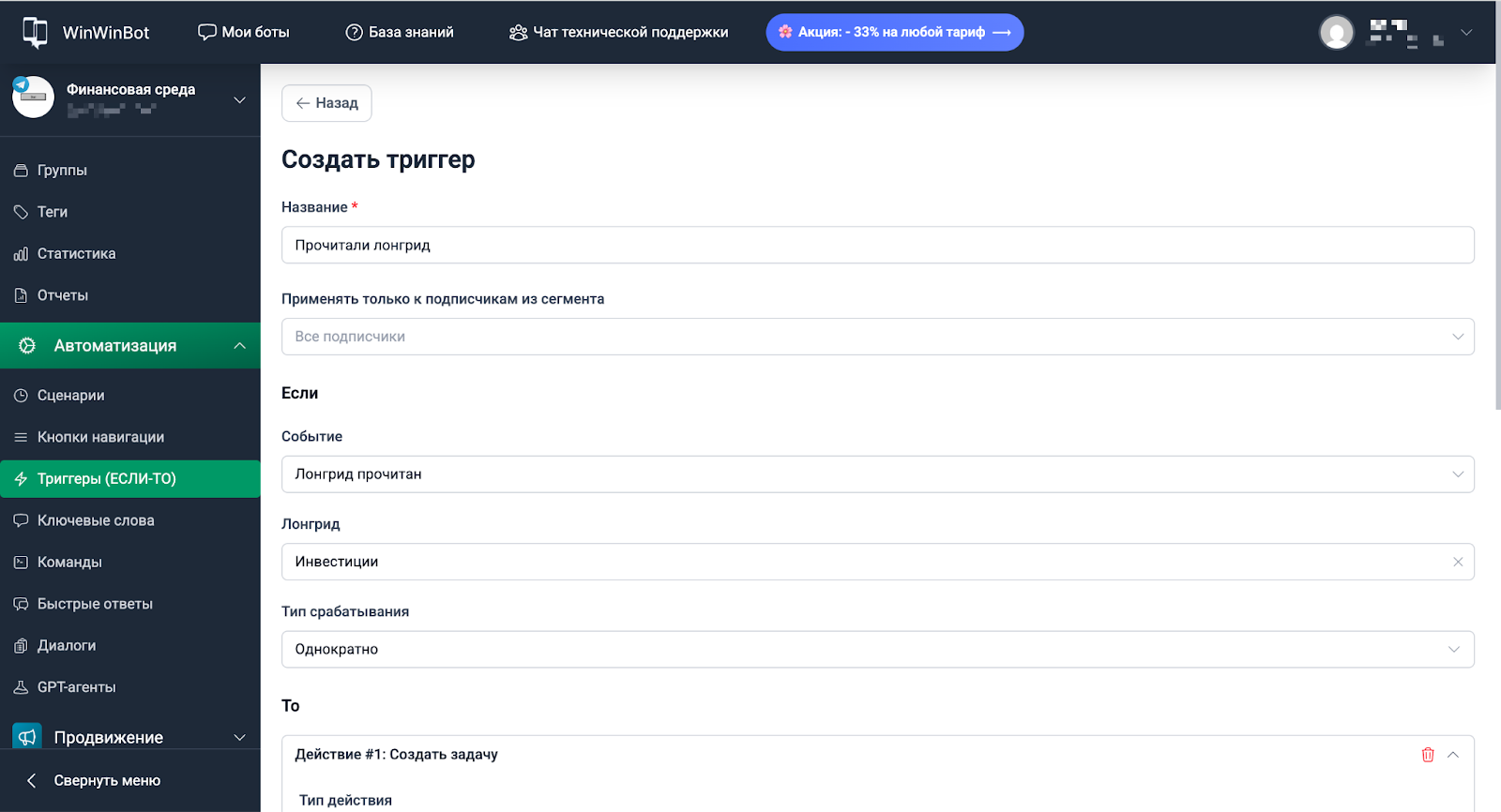 Событие: Подписчик впервые запустил бота → Действие: создать задачу «Позвонить» с назначением на ответственного менеджера. Тип срабатывания: однократно.
