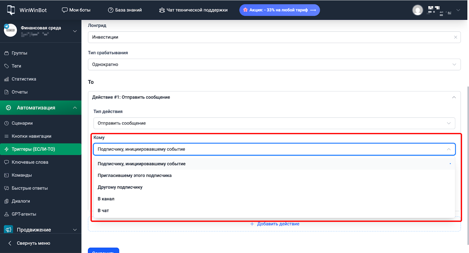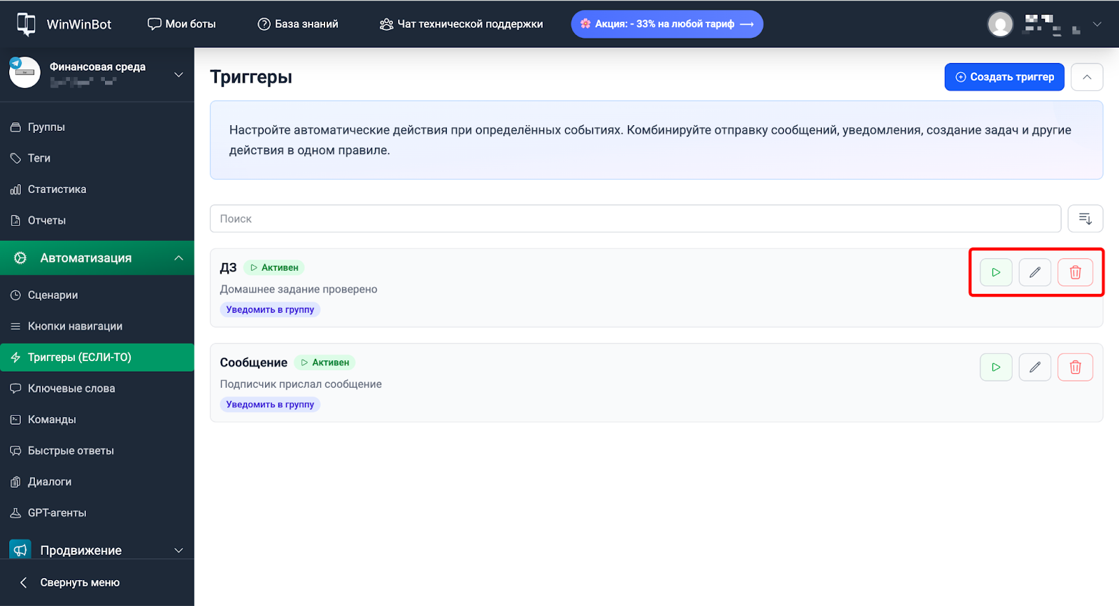 Триггеры — автоматические реакции на действия подписчиков. Настраиваем по принципу ЕСЛИ-ТО: бот следит за событием и выполняет нужное действие, когда оно происходит.