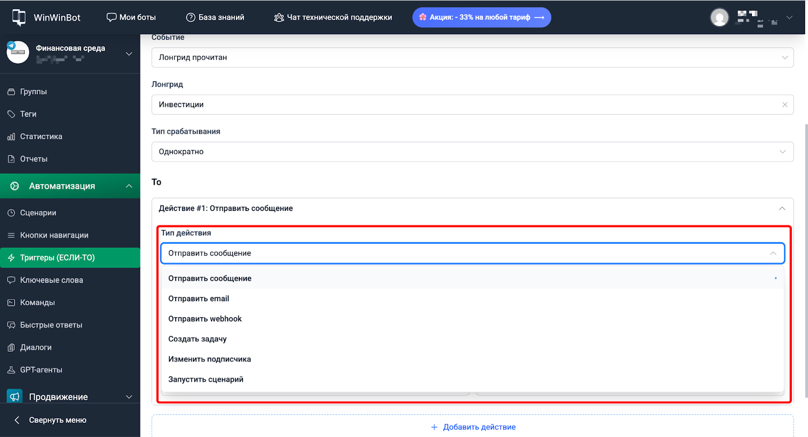 - Если нужно несколько действий — нажимаем + Добавить действие.