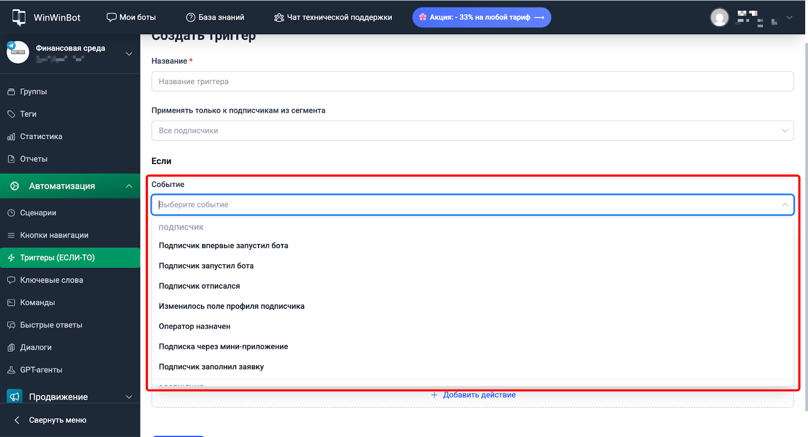ЕСЛИ — событие, которое запускает триггер: оплата, первый старт бота, вступление в канал и т.д.