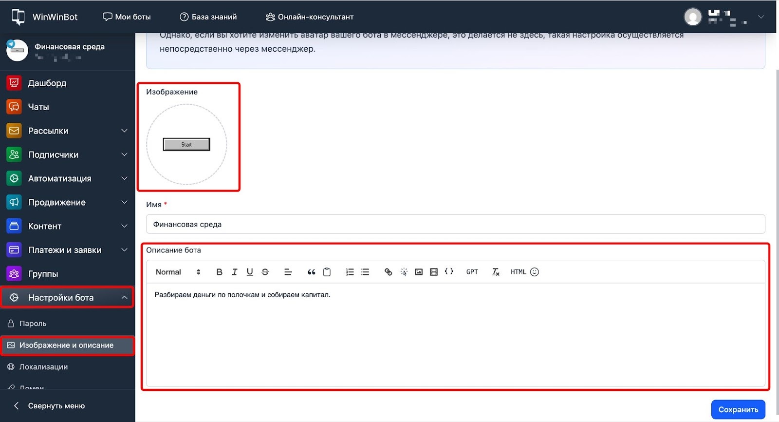 - Переходим в раздел Настройки бота → Изображение и описание.