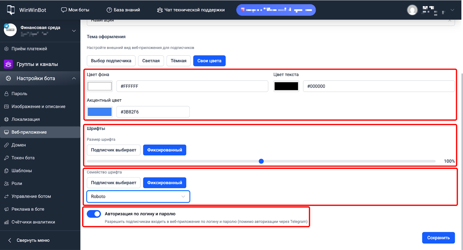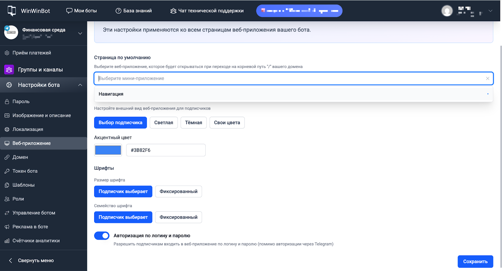 Раздел Настройки бота → Веб-приложение управляет глобальными параметрами всех веб-приложений бота: темой оформления, шрифтами, страницей по умолчанию и авторизацией подписчиков.