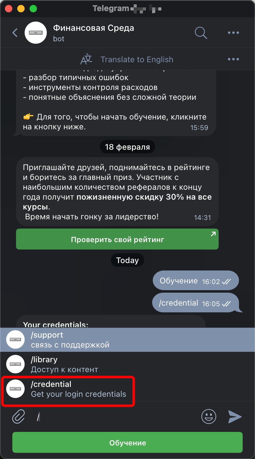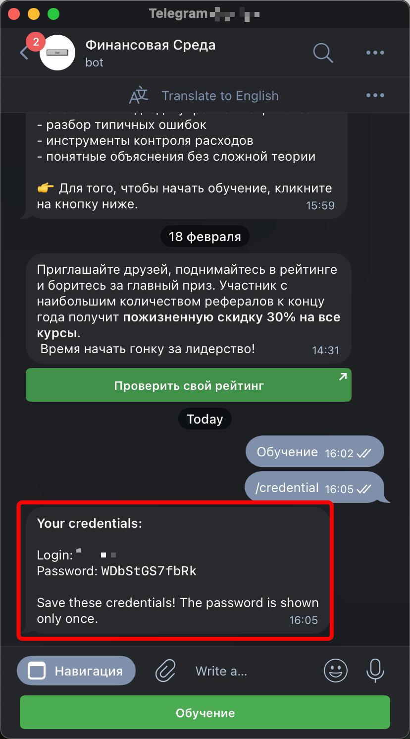Подписчик отправляет боту команду /credential. Бот присылает логин и пароль в ответном сообщении с пометкой «Пароль показывается один раз» — подписчику нужно сохранить данные сразу.