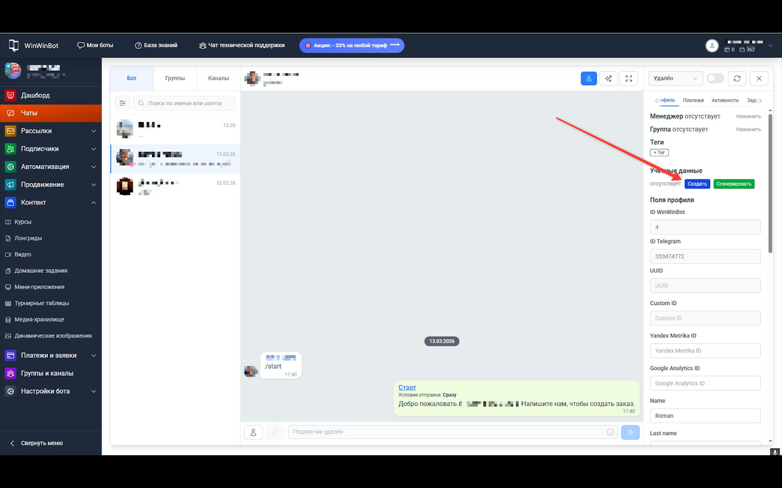 - Открываем раздел Чаты → кликаем на нужного подписчика.