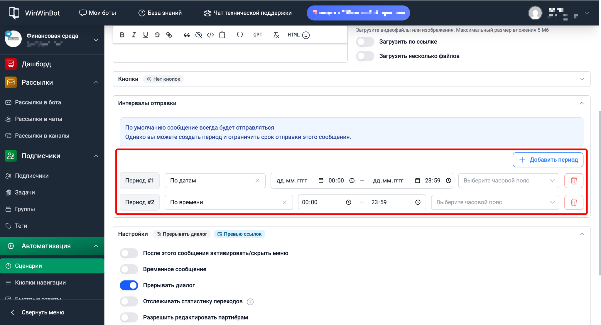 По умолчанию сообщение отправляется всегда. Через + Добавить период можно ограничить срок отправки — тогда сообщение уйдёт только в заданный промежуток.