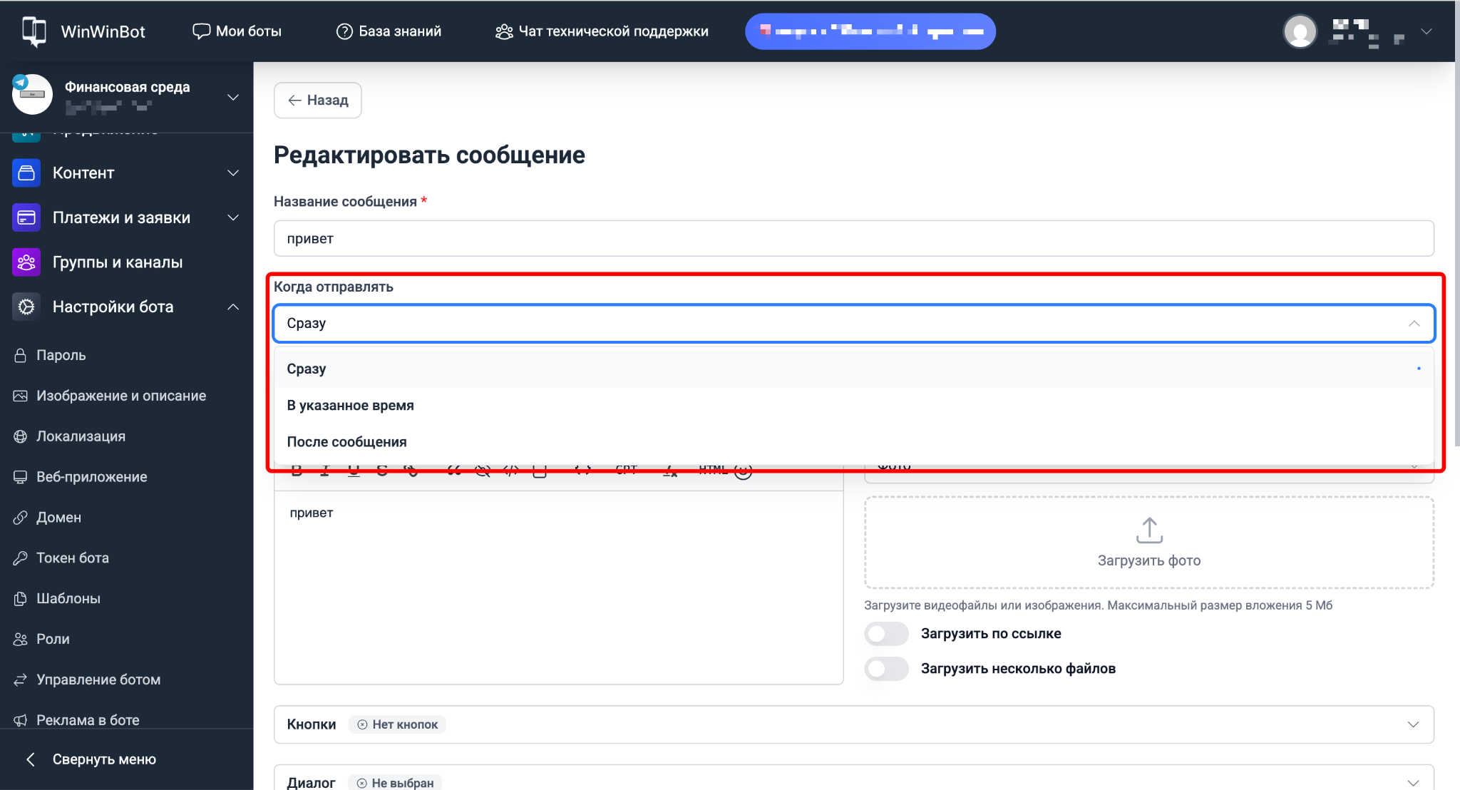 - Указываем Когда отправлять — сразу, с задержкой или после определённого сообщения.