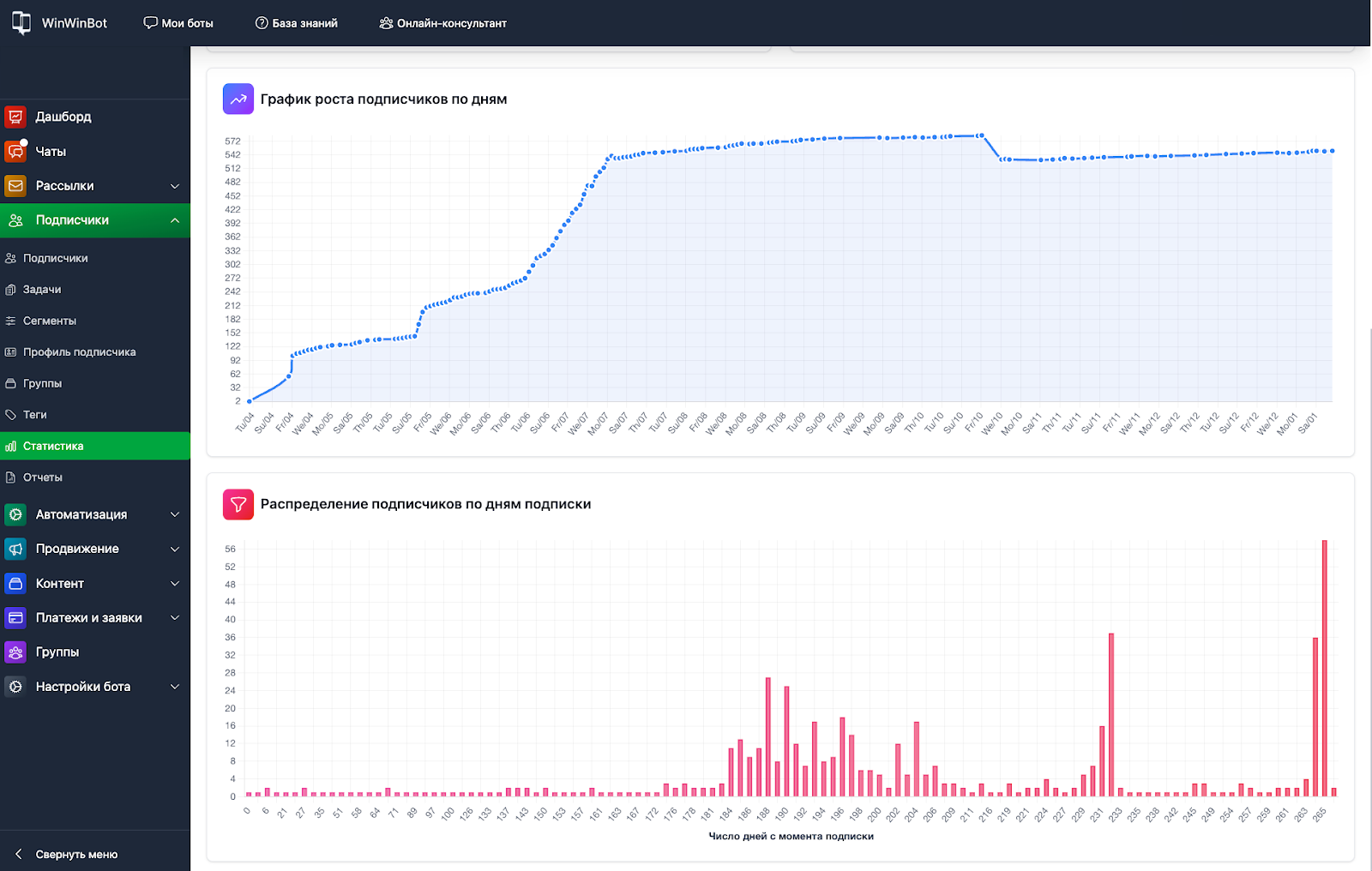 Кнопка Полная статистика в правом верхнем углу дашборда открывает детальный отчёт о подписчиках.