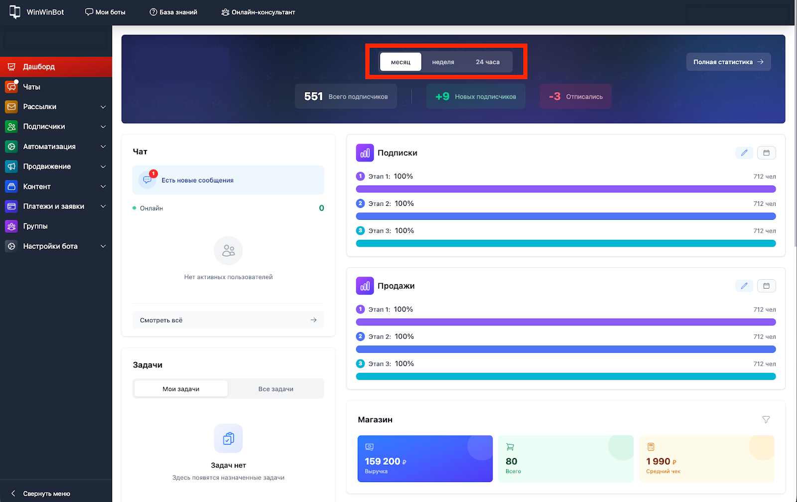 Статистика обновляется автоматически в зависимости от выбранного периода.