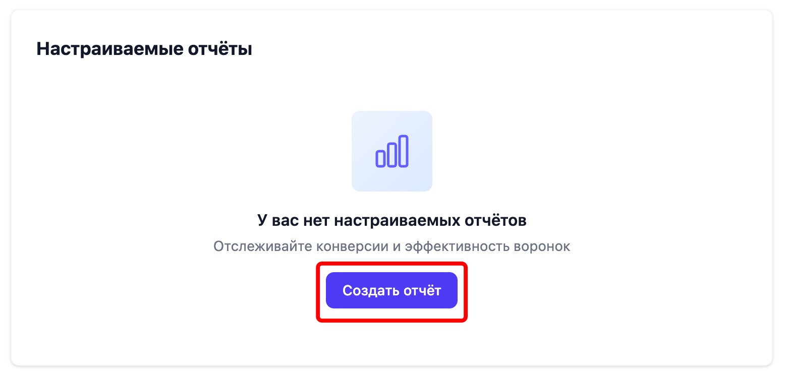 Раздел Настраиваемые отчёты позволяет создавать воронки для отслеживания конверсий между событиями в боте. Подробнее о работе с Отчётами.