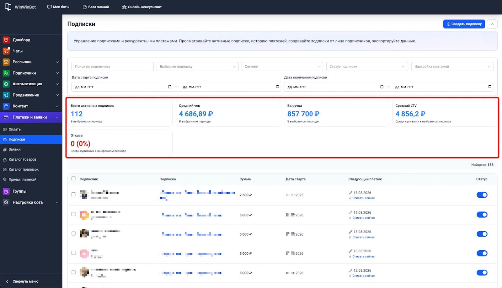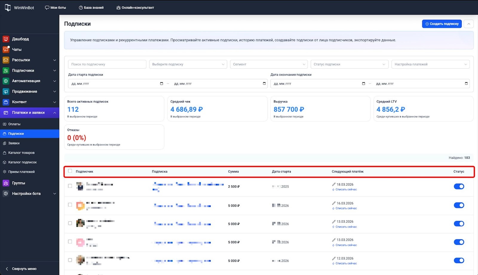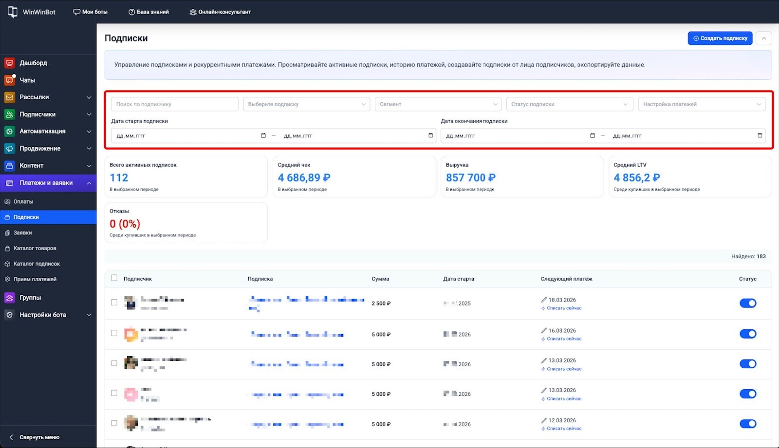 Подписка — это тарифный план с регулярными автоматическими списаниями. Страница позволяет отслеживать статус подписок, управлять автопродлением и выполнять массовые действия.
