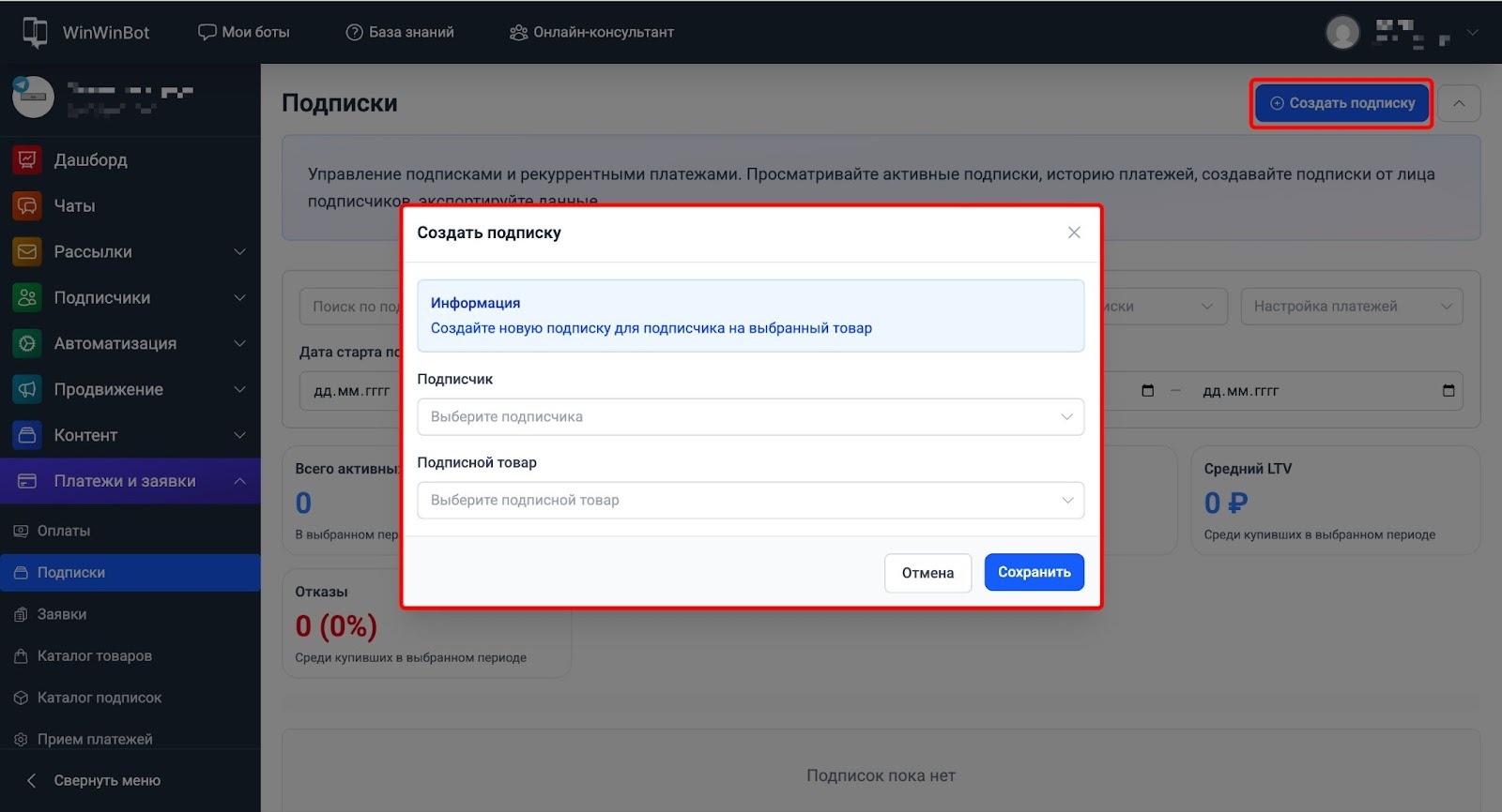 Нажимаем кнопку Создать подписку в правом верхнем углу.