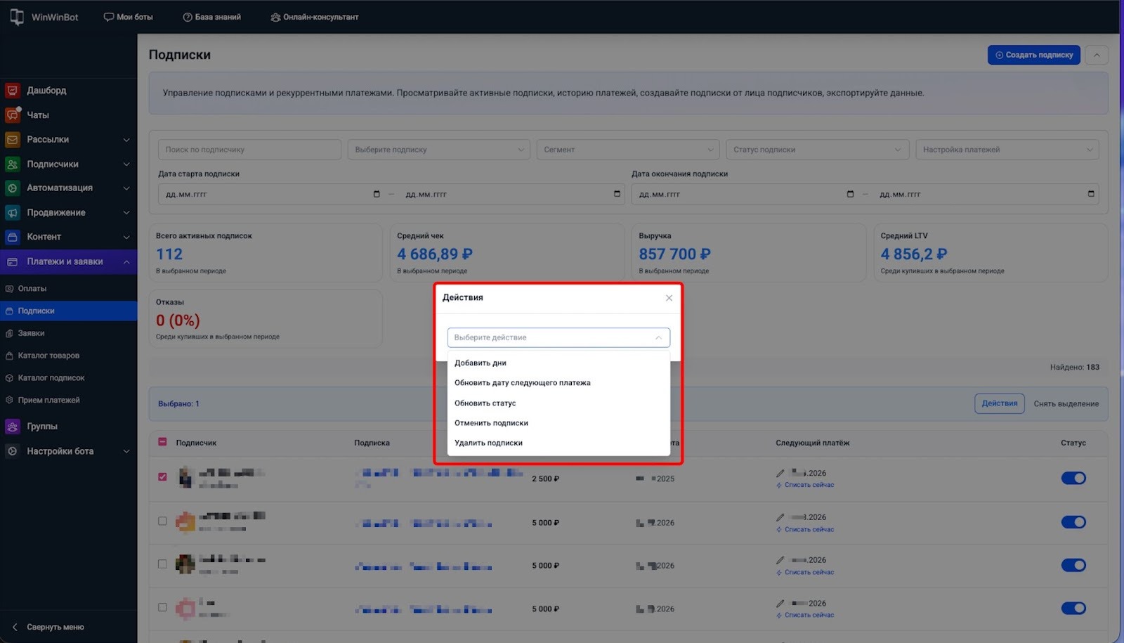 Обновить статус — массово изменяет статус выбранных подписок. Доступны те же статусы, что и в фильтре.