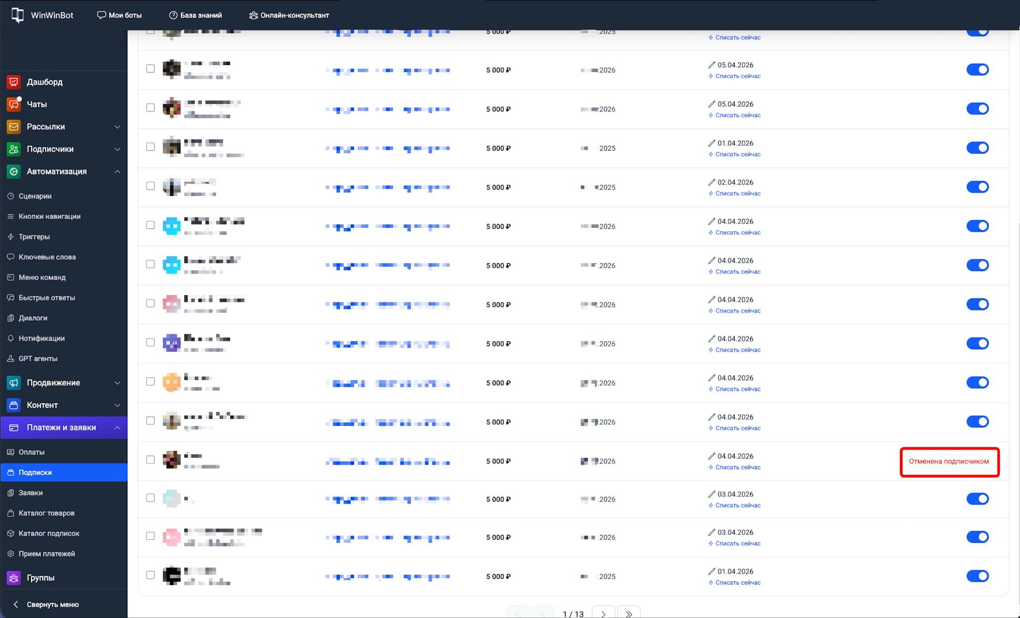 Нажатие на синий переключатель отключает автопродление подписки для этого конкретного пользователя. Подписка переходит в статус Отменена администратором, автоматические списания прекращаются.