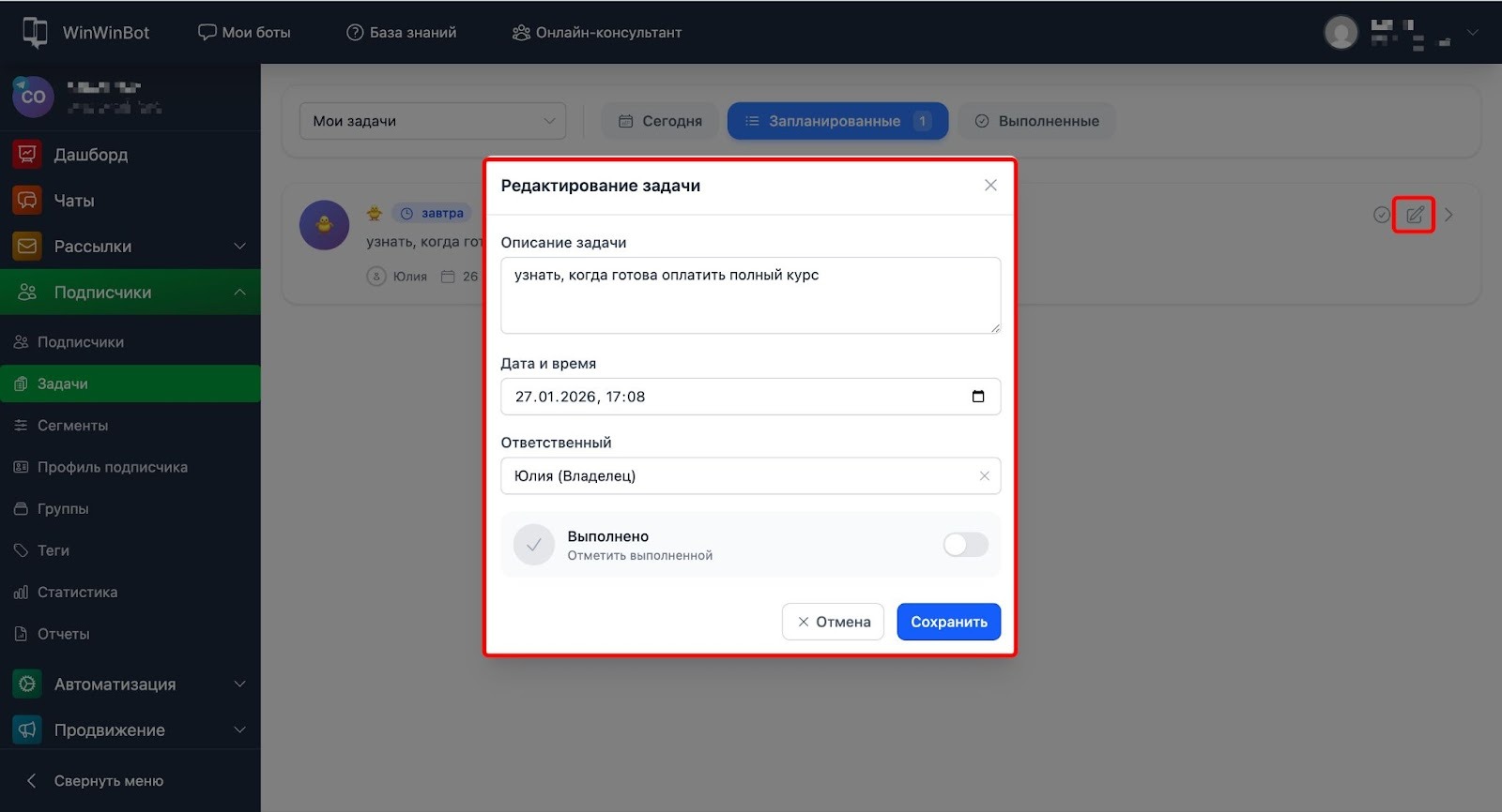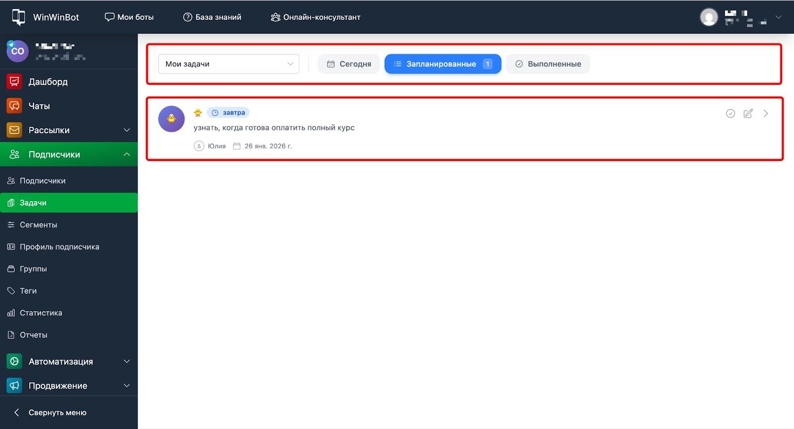 Задачи позволяют организовать индивидуальную работу с подписчиками бота. Это упрощённая CRM-система внутри WinWinBot, которая помогает не забывать о важных действиях по каждому клиенту.