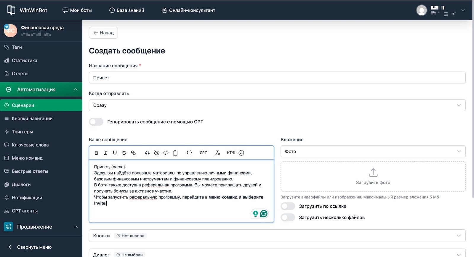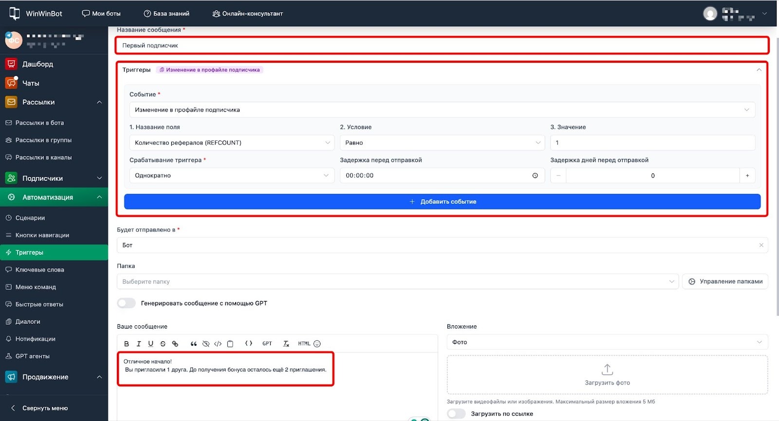 - В сообщении используем переменную {name} для персонализации и добавляем кнопку перехода в канал.