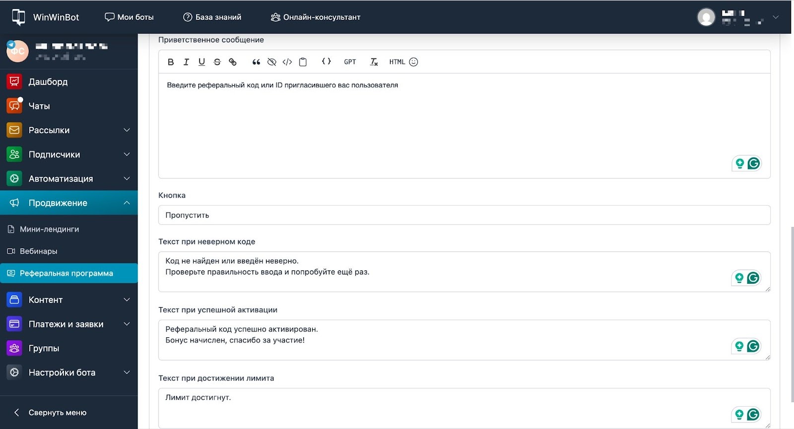 - В поле Текст при успешной активации составляем сообщение-подтверждение (например, «Реферальный код принят!»).