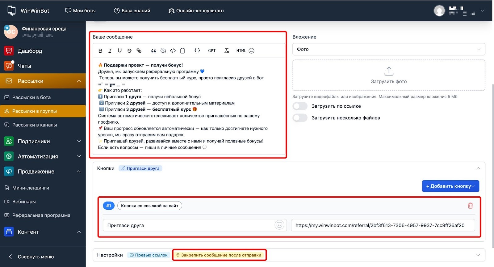 - Закрепляем сообщение в канале с призывом поддержать проект и получить бонус.