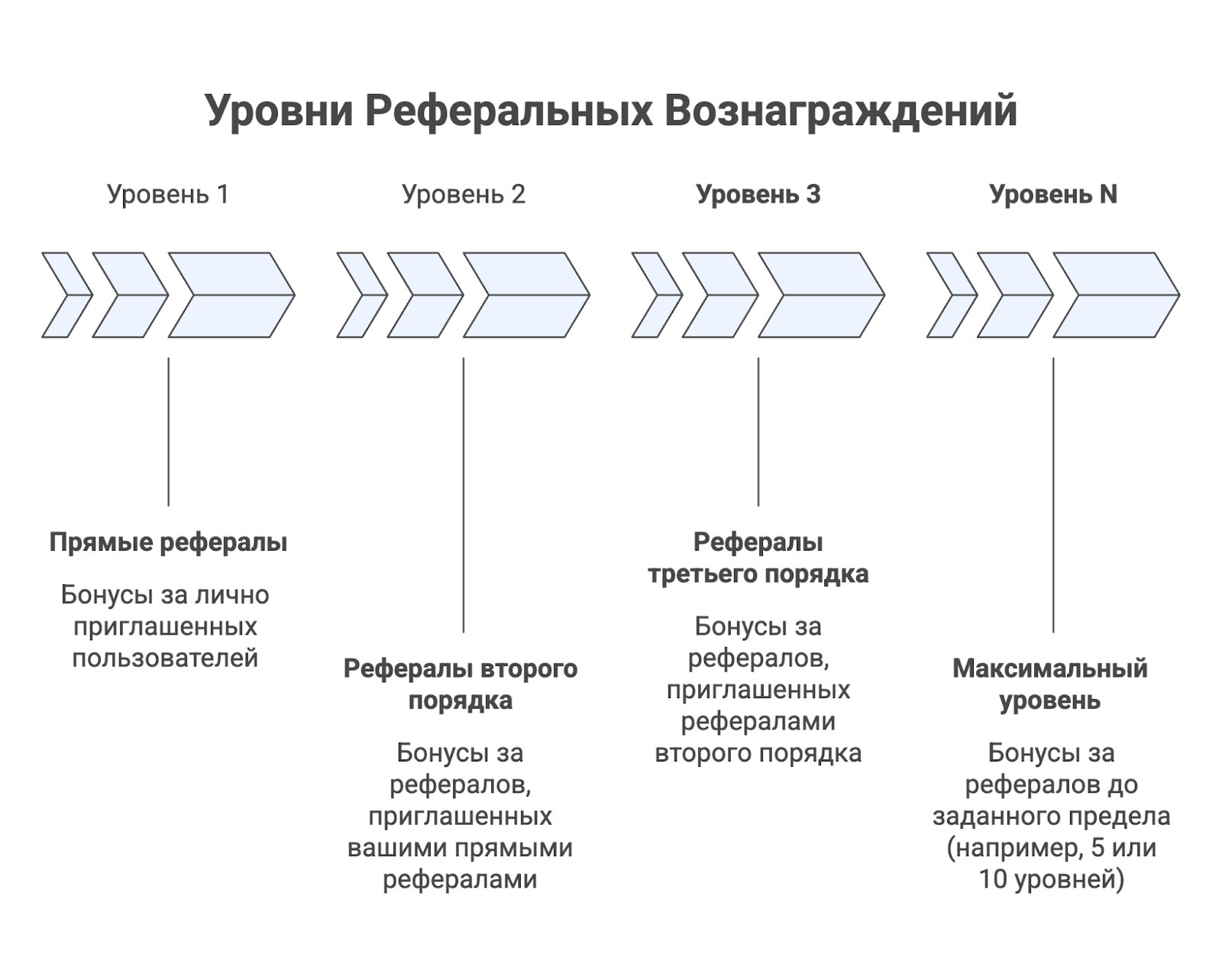 Например, если настроено 5 уровней, можно распределять вознаграждения не только за лично приглашённых, но и за приглашённых второго, третьего порядка — вплоть до пятого уровня. Если настроено 10 уровней — соответственно, до десятого.