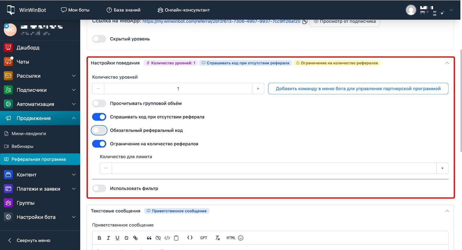 - В поле Приветственное сообщение вводим текст, который получит подписчик при включенной функции Спрашивать код при отсутствии реферала.