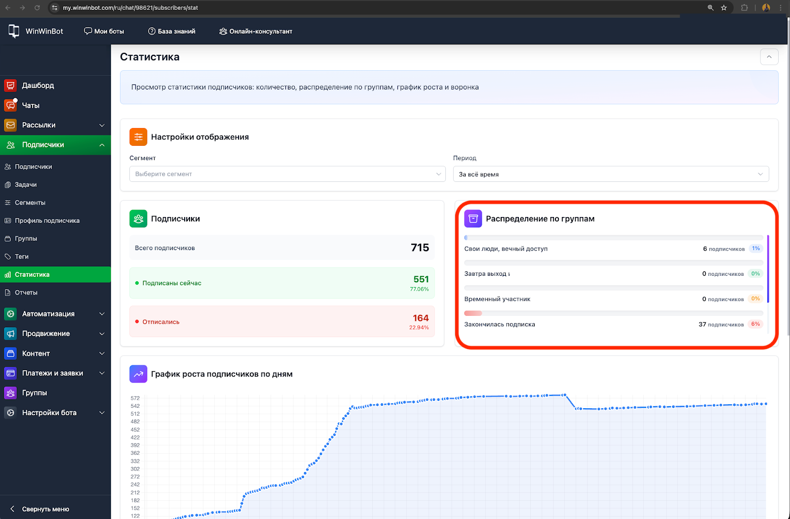 Вкладка Статистика в разделе Подписчики собирает данные о вашей аудитории: количество, распределение по группам, динамику роста и поведение.