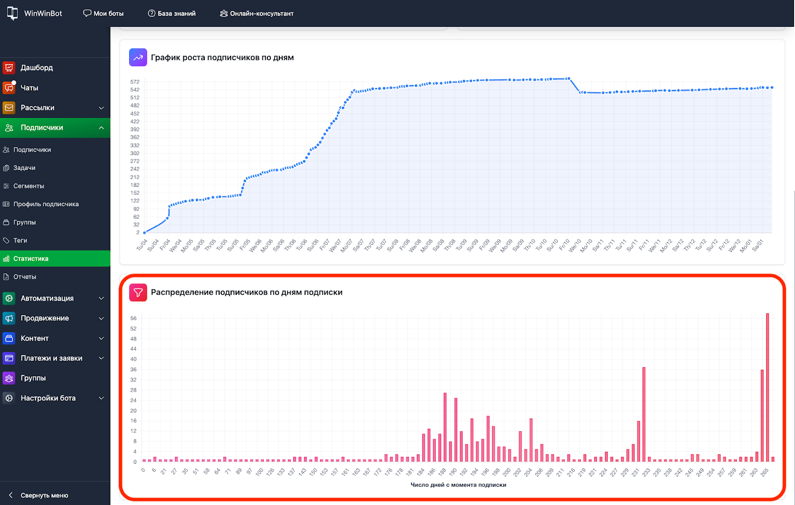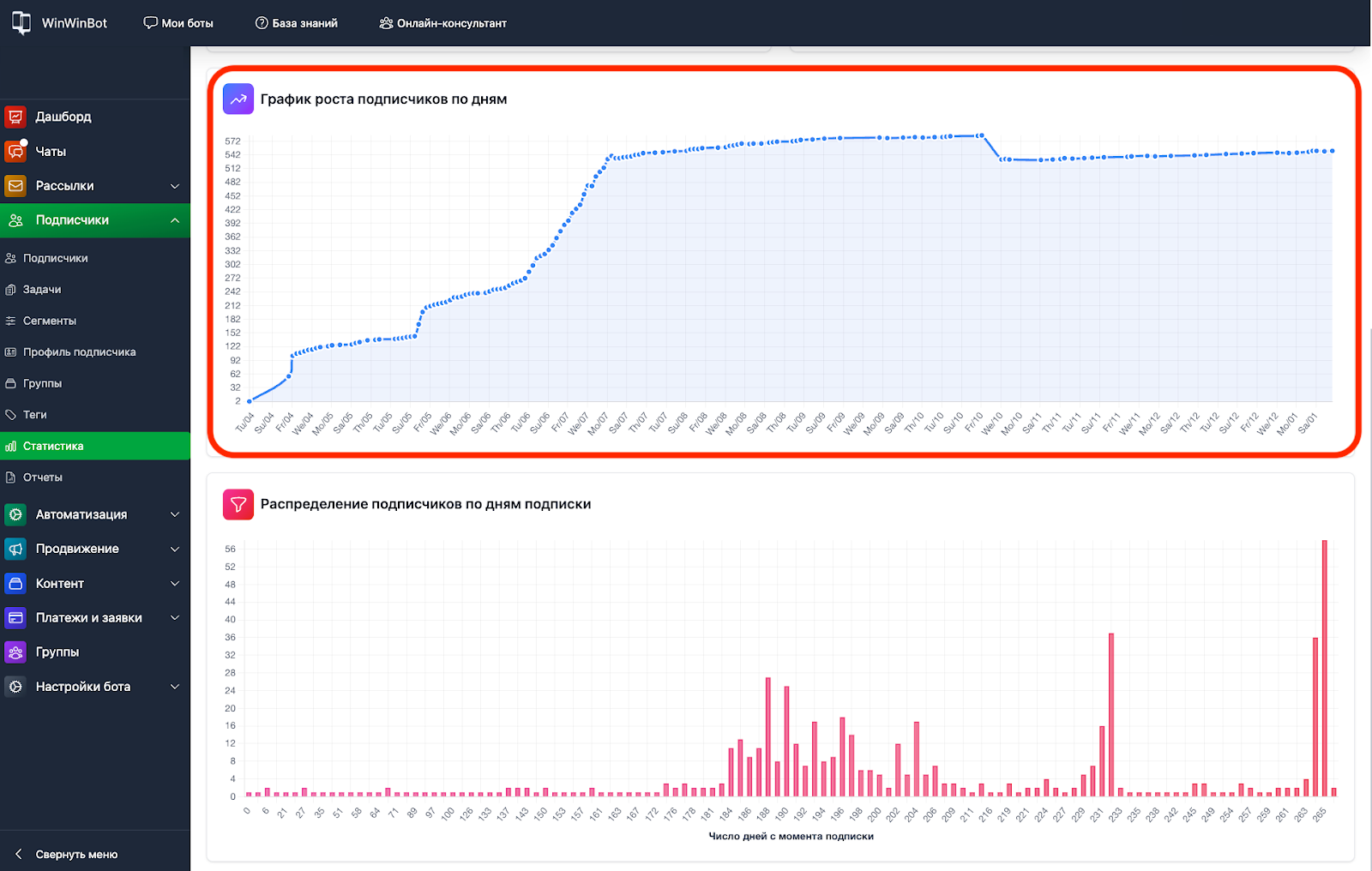 Анализ роста: Сравните графики за разные периоды, чтобы понять, какие действия привели к росту базы.