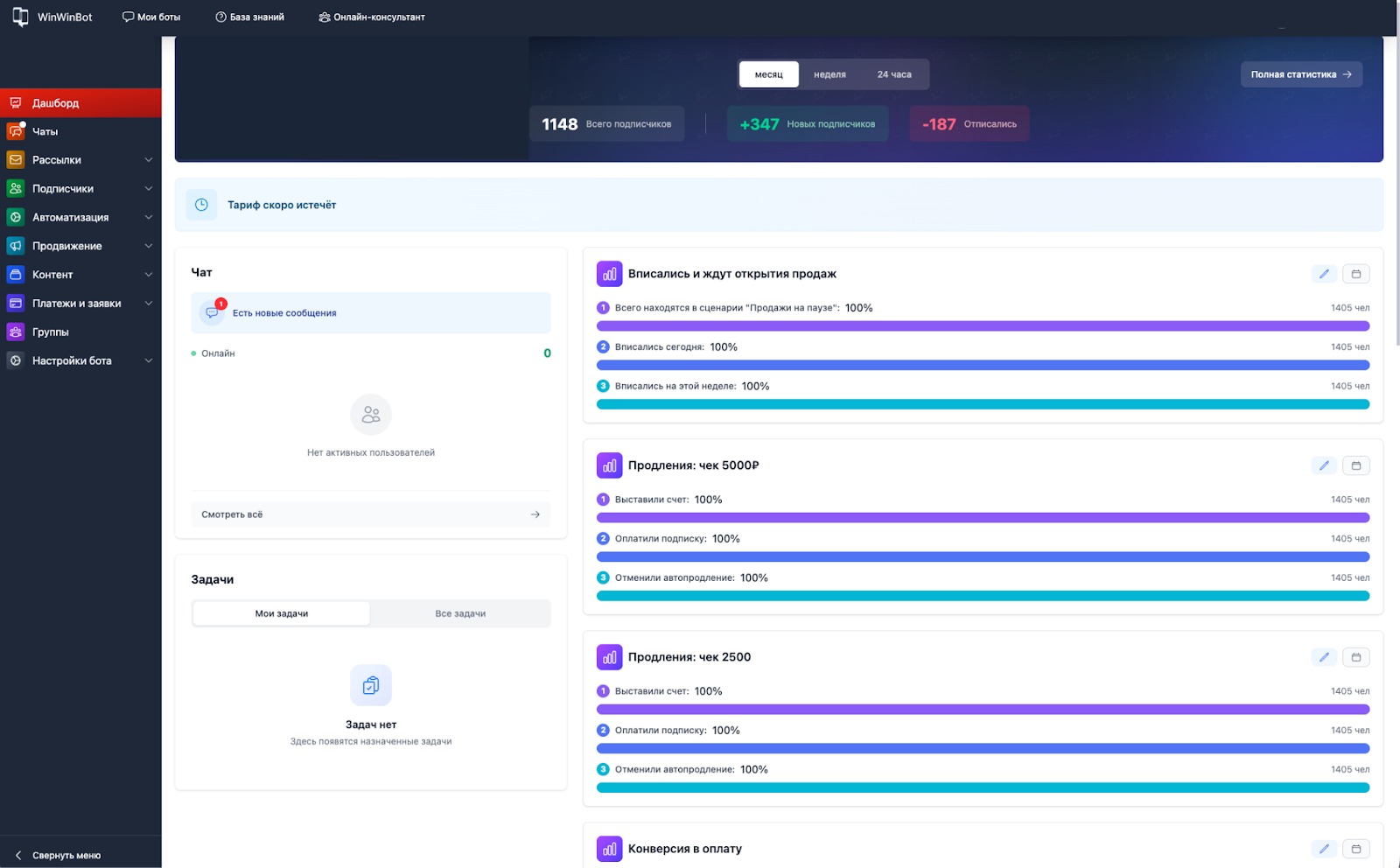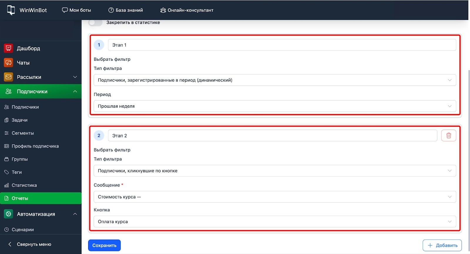 Отчёты — инструмент для отслеживания конверсий и анализа поведения подписчиков на каждом этапе взаимодействия с ботом.