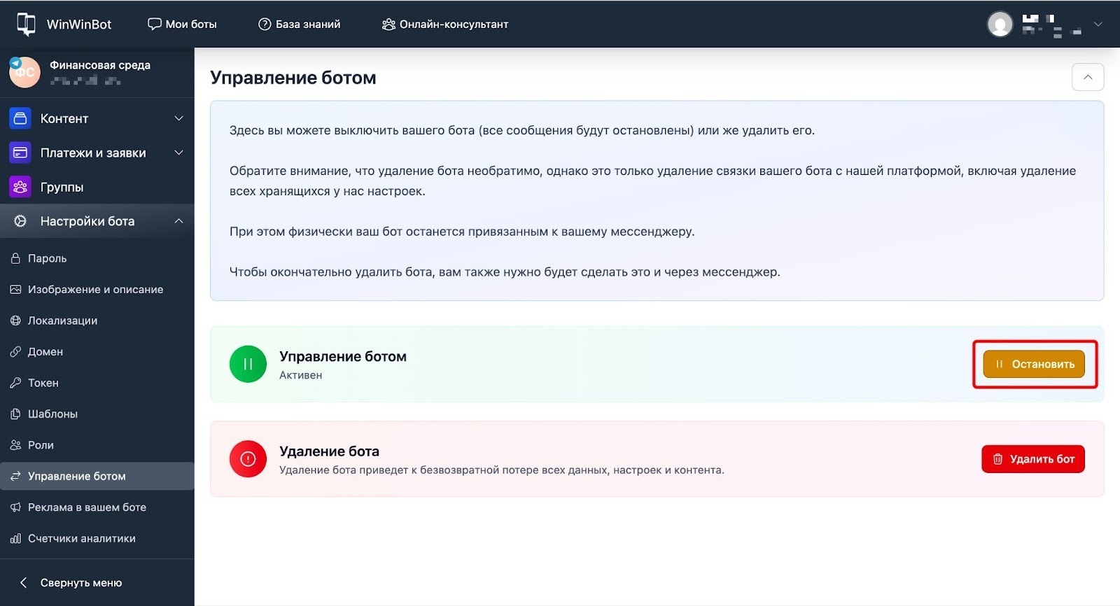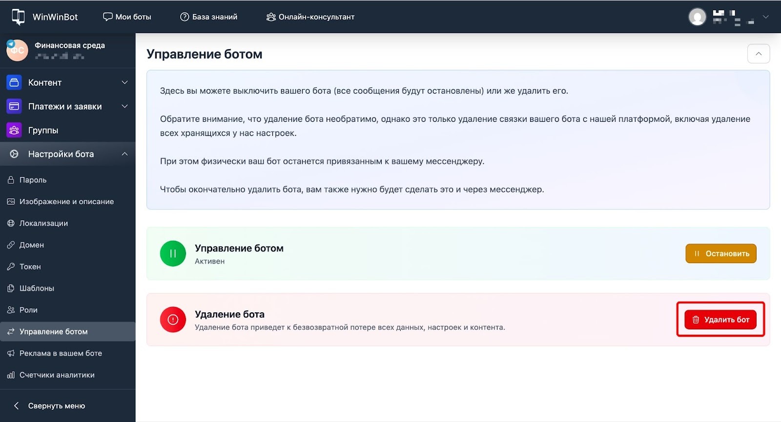 Удаление бота из WinWinBot отвязывает его от платформы и удаляет все данные, настройки и контент. При этом сам бот в Telegram остаётся активным и привязанным к вашему мессенджеру.