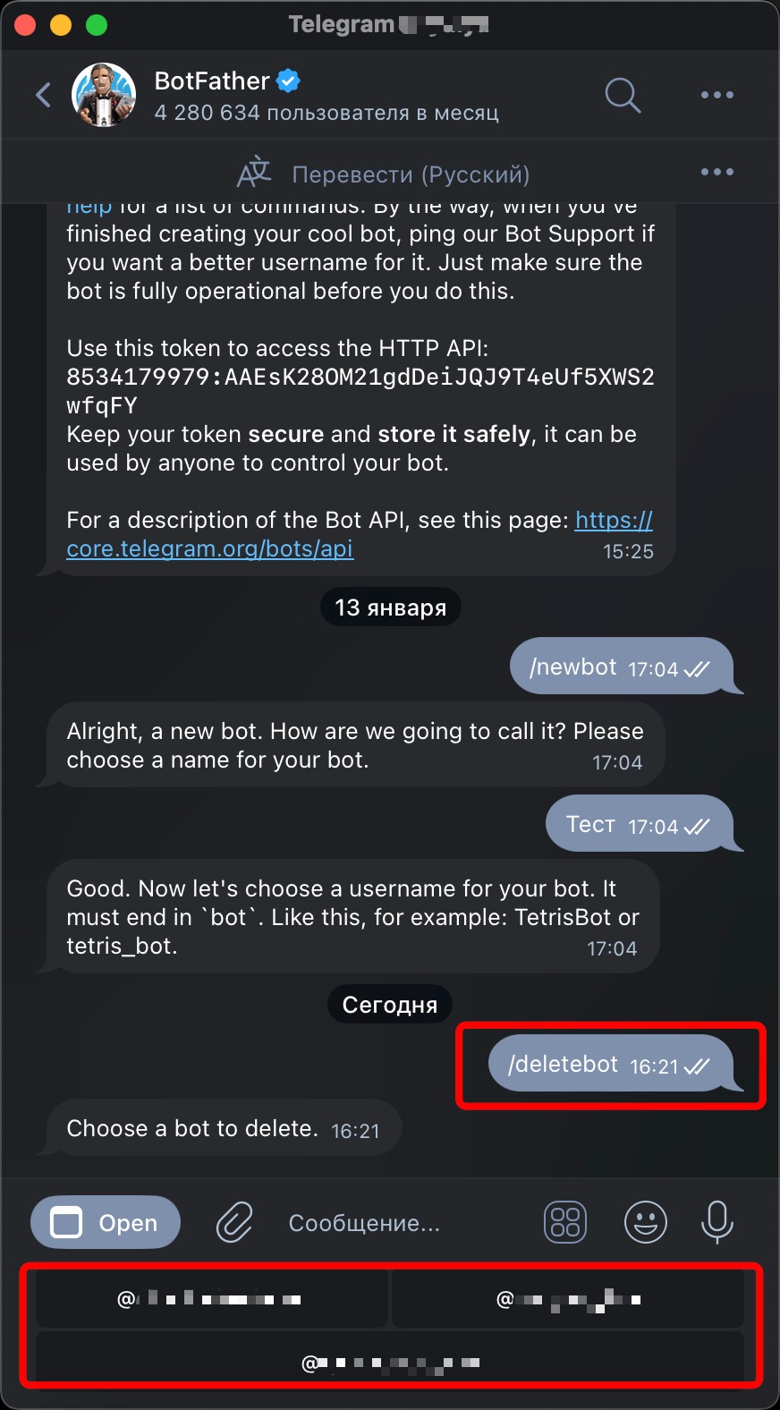 - Прокручиваем страницу вниз до блока Удаление бота.